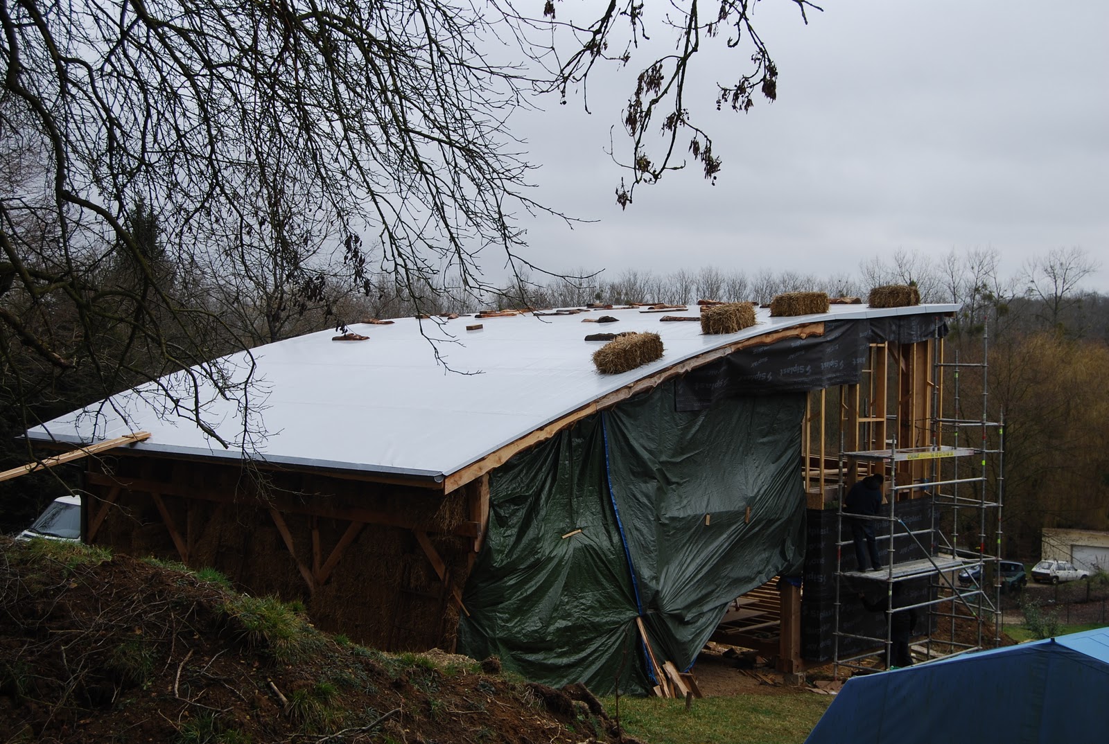 Le principe de cette maison réside dans son isolation par des bottes de paille pour les murs, planchers et toiture. Pensé comme une collaboration avec les artisans locaux et différentes associations, ce chantier participatif a permis de réaliser plusieurs parties de la maison : l’étanchéité, l’isolation en paille et la toiture végétale.