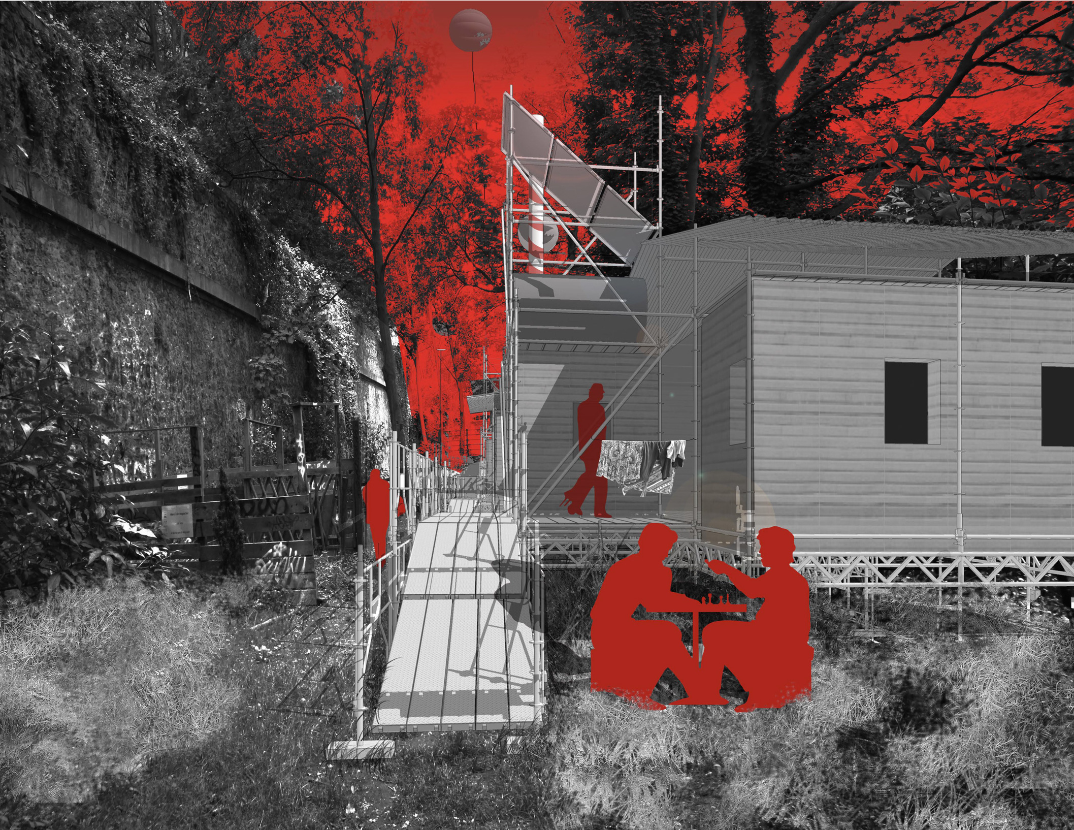En primer lugar, nuestro proyecto Saga-cité es uno de los 10 ganadores de la consultación “Paris de l’Hospitalité” (Paris de la Hospitalidad) , consultación internacional de arte y arquitectura para la creación de centro de alojamiento nómade en París intra -muros. Nuestra respuesta a esta convocatoria de proyectos del PEROU   – Polo de Exploración Recursos Urbanos y les Enfants du Canal ( organización nacida después del acampe de personas en situación de calle en los muelles del canal Saint-Martin) –  elije el nomadismo  como uno de los pilares del centro de alojamiento, despertando los (demasiados) muchos sitios olvidados de París, a favor de los que viven en los intersticios de la ciudad. Con el circo como tema, Saga-cité se compone de habitaciones y lugares colectivos, repartidos en los andamios, carpas de circo y módulos de madera. El proyecto reserva  por supuesto una parte importante a la ecología, usando  aislamiento reciclado, torres técnicas de energía y una estrategia para la recuperación de aguas residuales. Unas temáticas que nos importan mucho, y que estamos orgullosos de ver puestas en valor con esta distinción!
