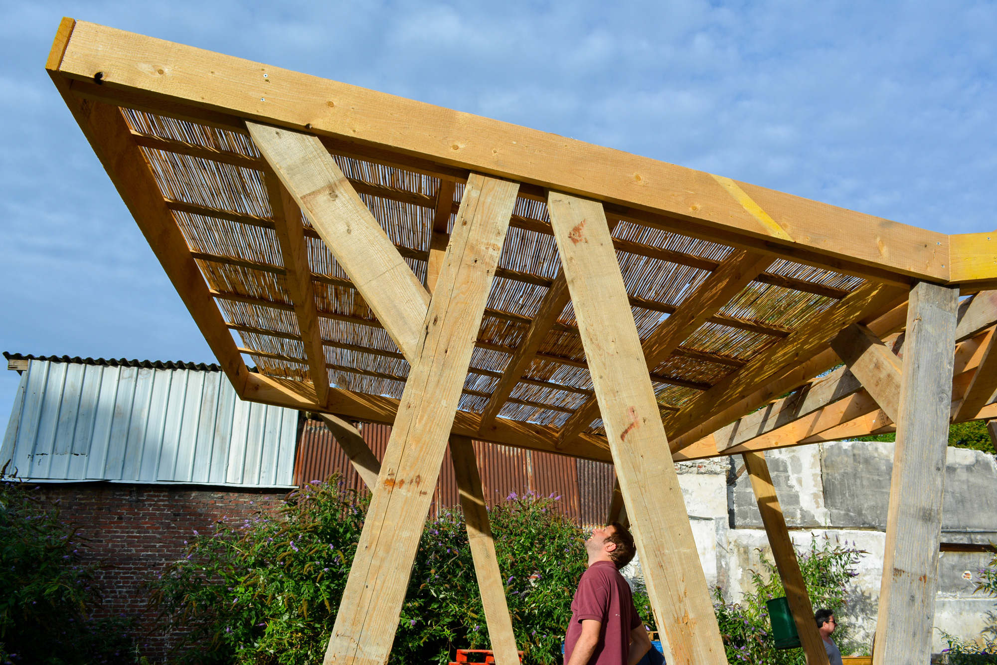 Durant le deuxième week-end, il y avait encore plus de monde dans le jardin, nombreux sont ceux qui sont venus mettre la main à la pâte sur le chantier. Guidé par notre architecte-charpentier, pièce maîtresse du dispositif constructif mis en place par le collectif s+A!, nous avons commencé à monter la structure en bois.