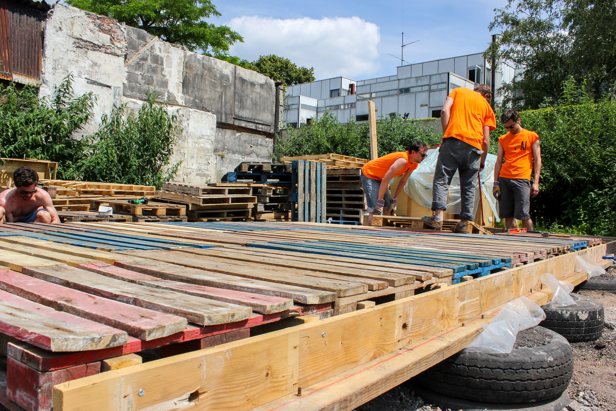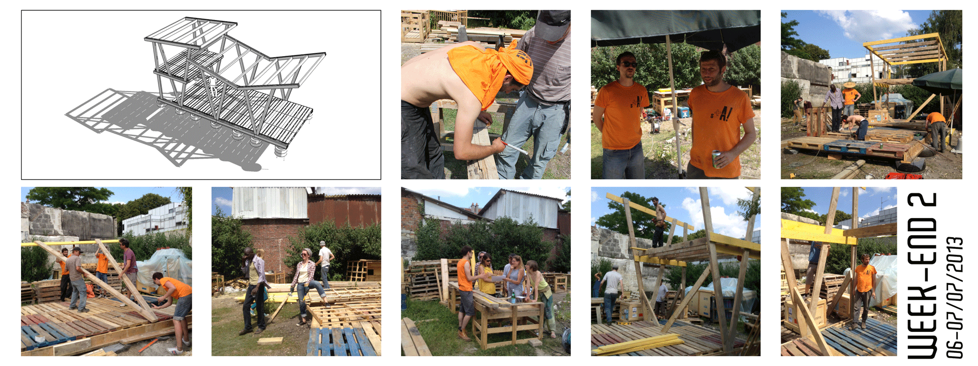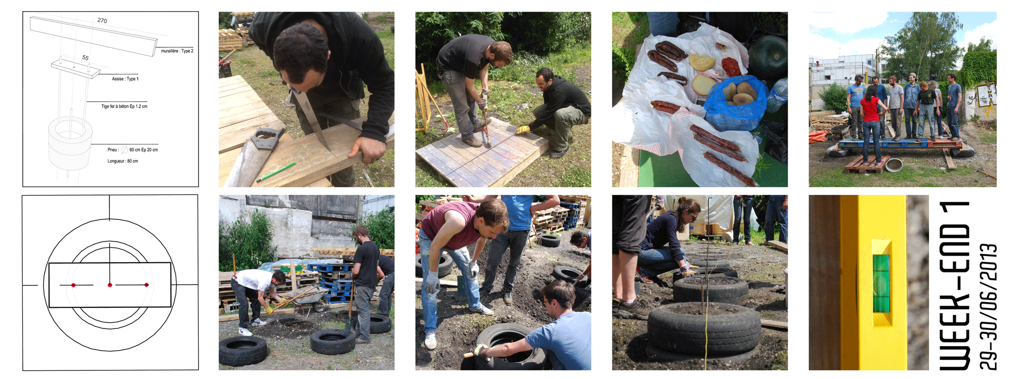 Le premier week-end de construction aura permis la réalisation des fondations en pneus, l’élaboration du solivage de plancher et la mise en place d’un certain nombre de palettes. s+A! était munis de merveilleuses pièces graphiques et une vingtaine de volontaires de Banane Pantin se sont relayés durant le week-end pour participer à la construction.