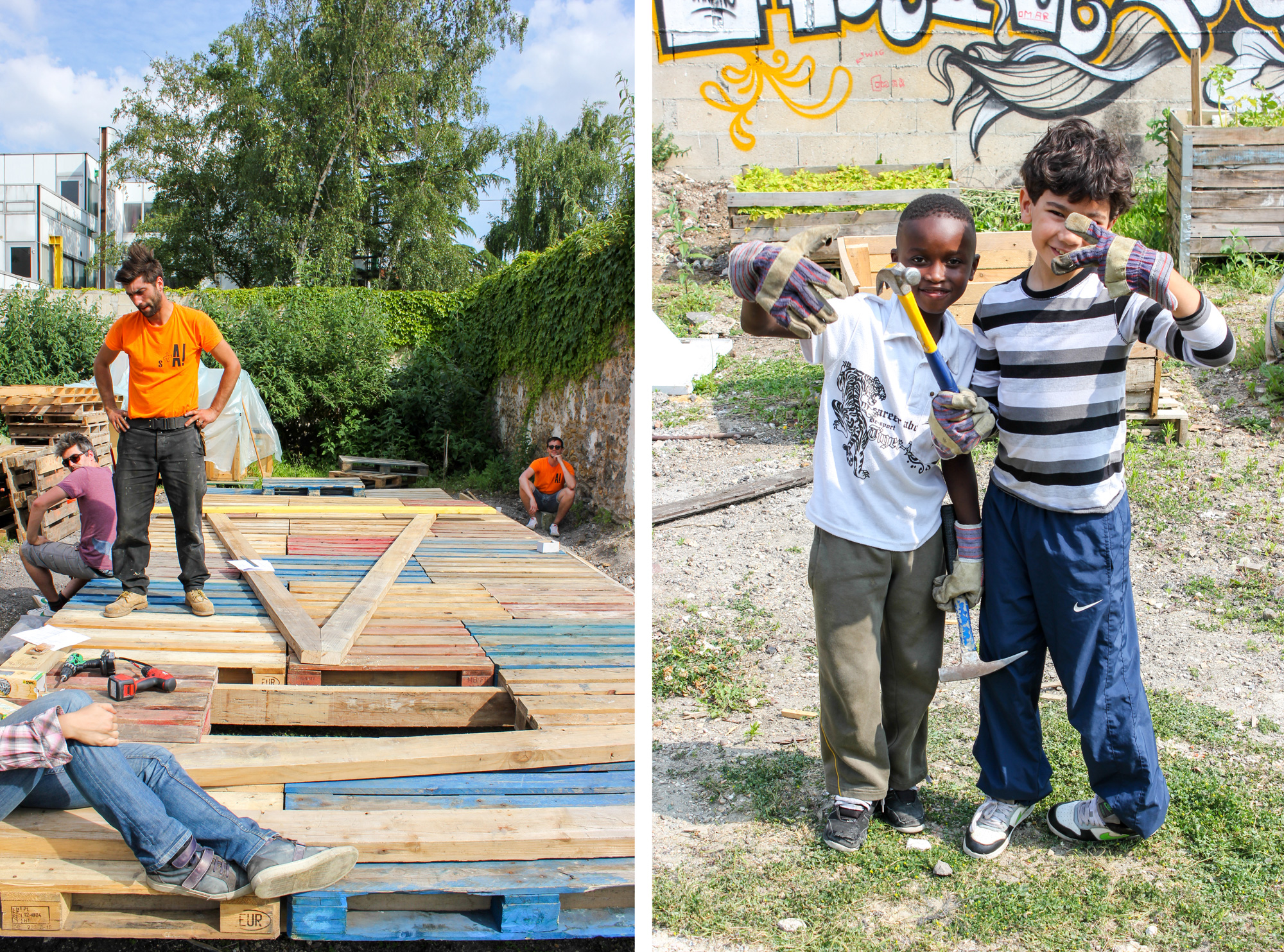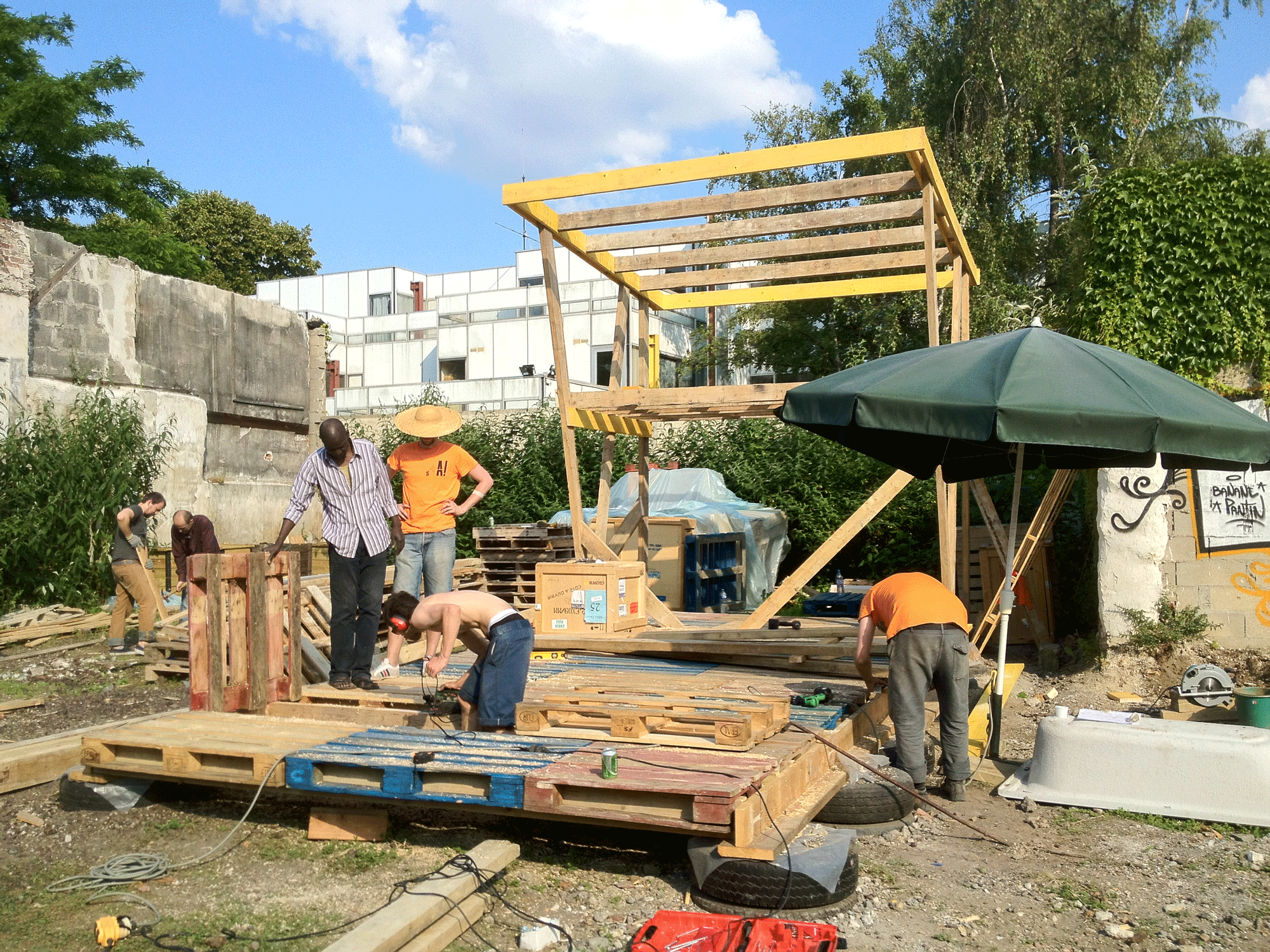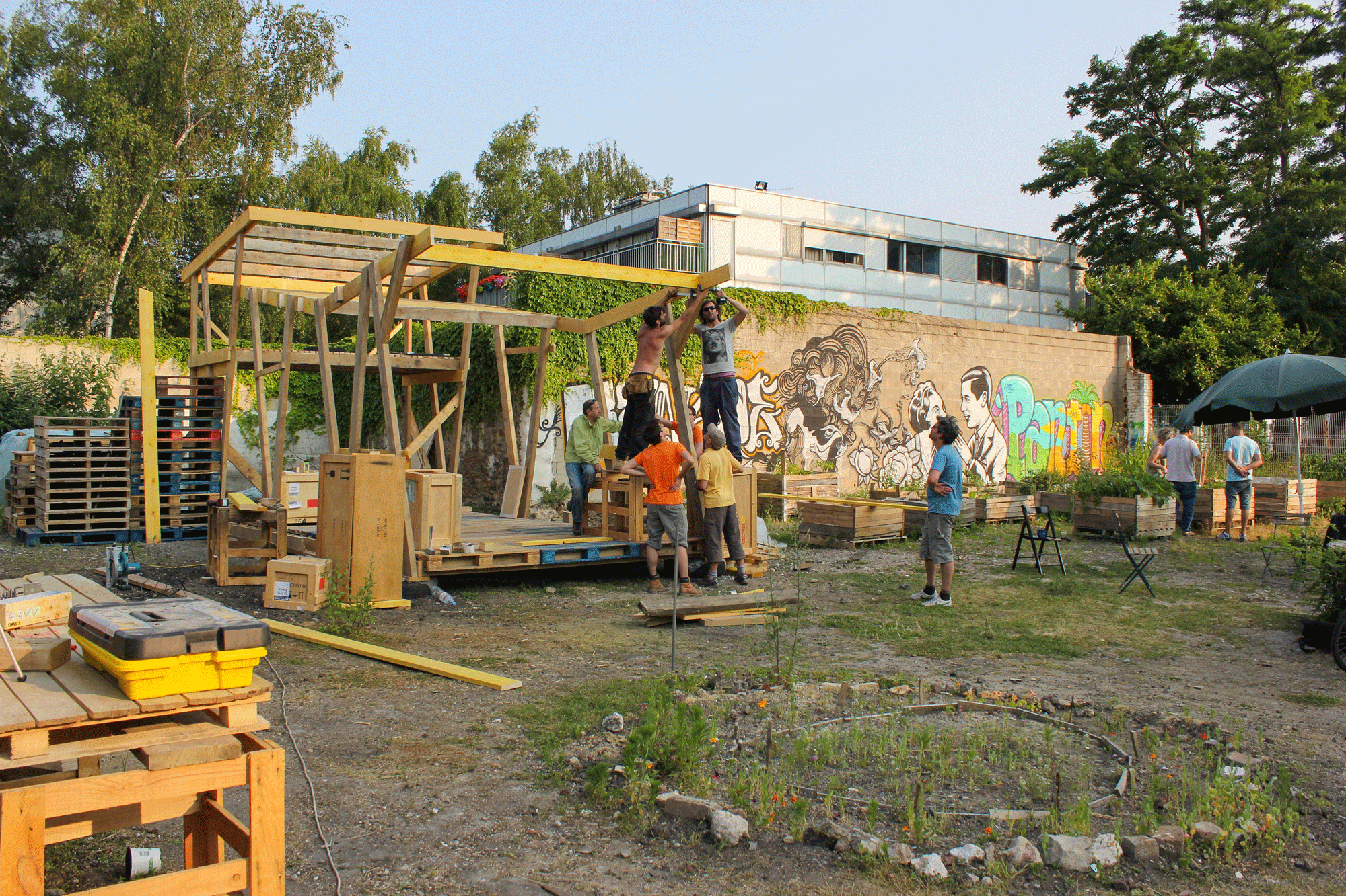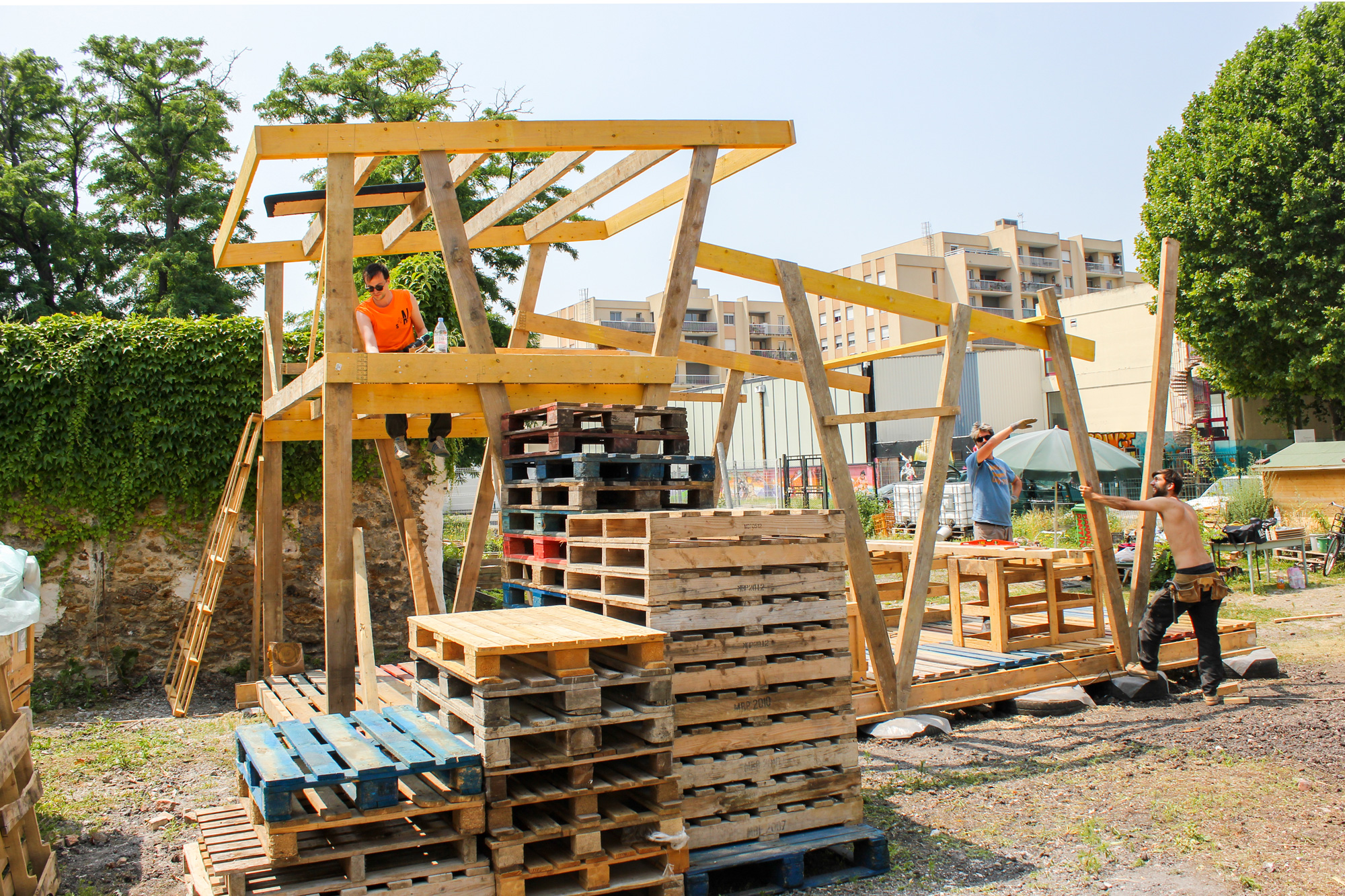 En attendant de pouvoir s’abriter dessous pour se protéger du soleil ou de la pluie, de profiter de son plancher pour faire des représentations ou des festins, les membres de l’association Banane Pantin ont prêté main forte aux architectes de Sans plus Attendre et ont bravé le soleil de plomb pour concrétiser le projet.