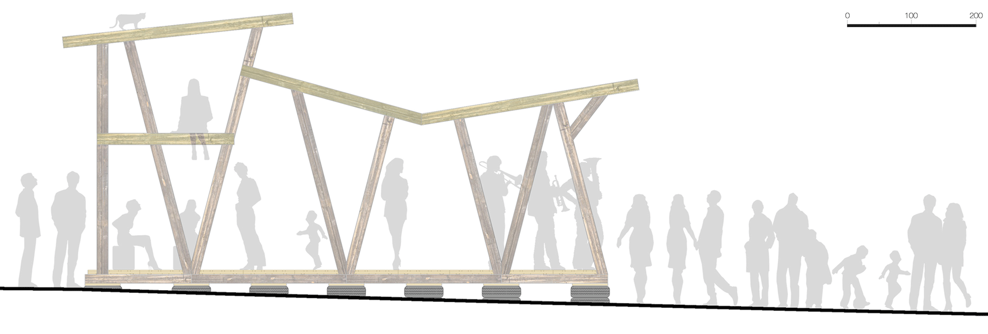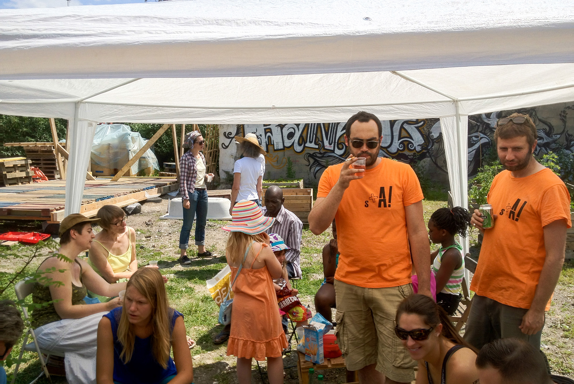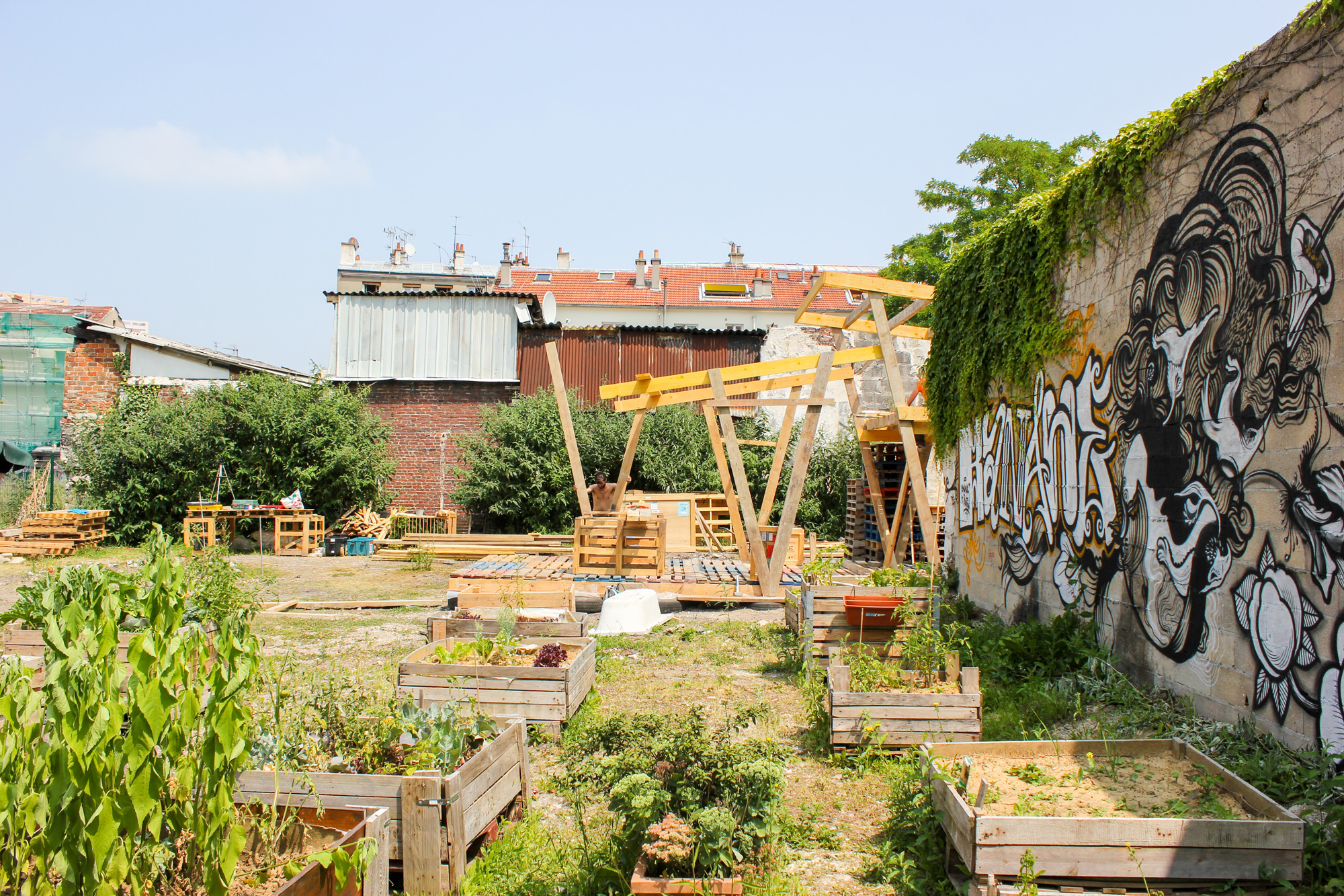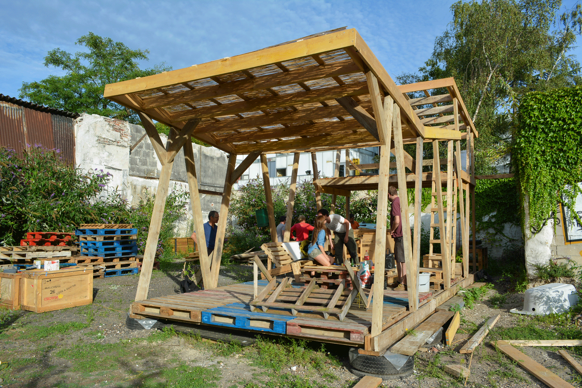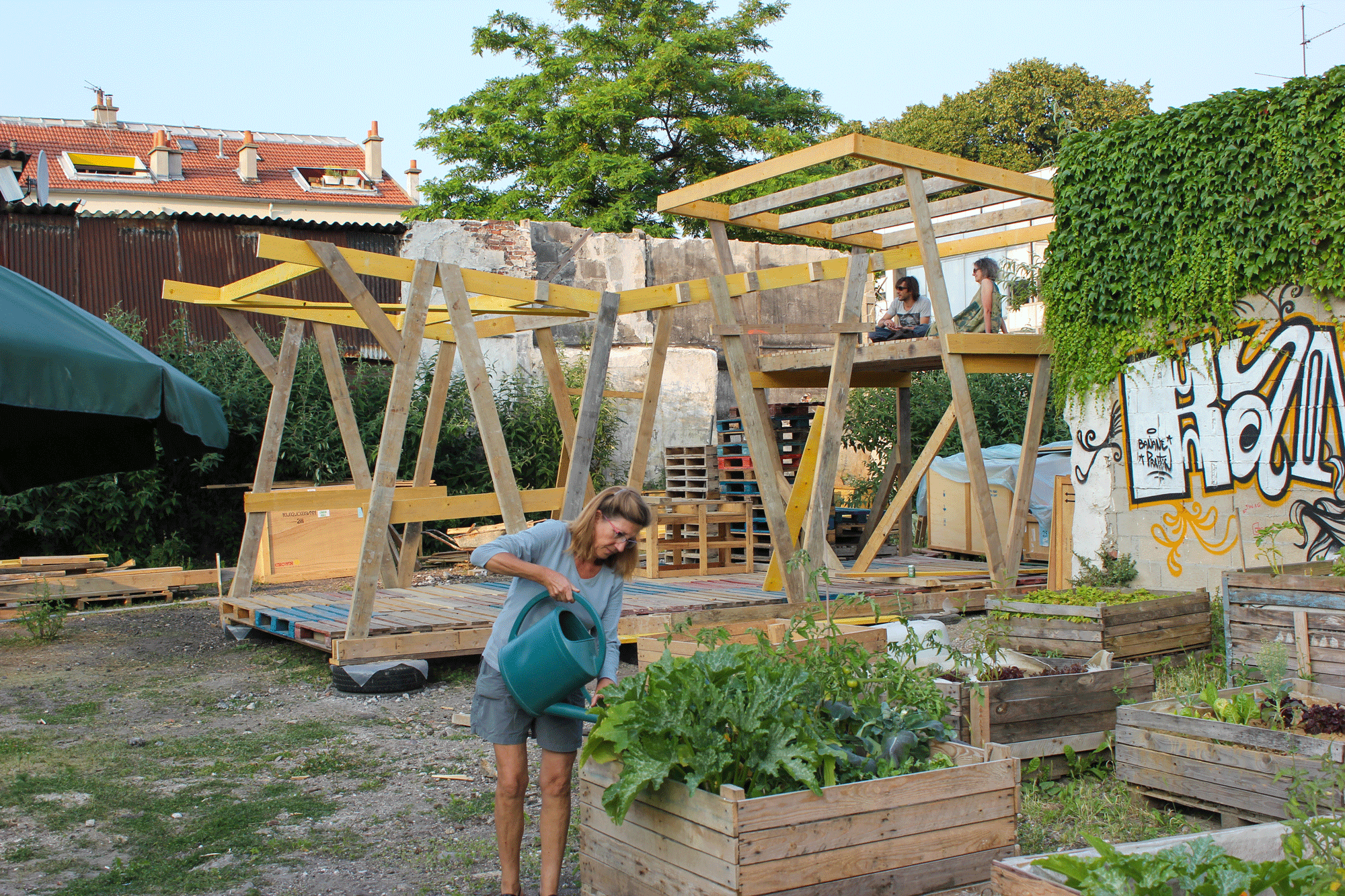 En attendant de pouvoir s’abriter dessous pour se protéger du soleil ou de la pluie, de profiter de son plancher pour faire des représentations ou des festins, les membres de l’association Banane Pantin ont prêté main forte aux architectes de Sans plus Attendre et ont bravé le soleil de plomb pour concrétiser le projet.
