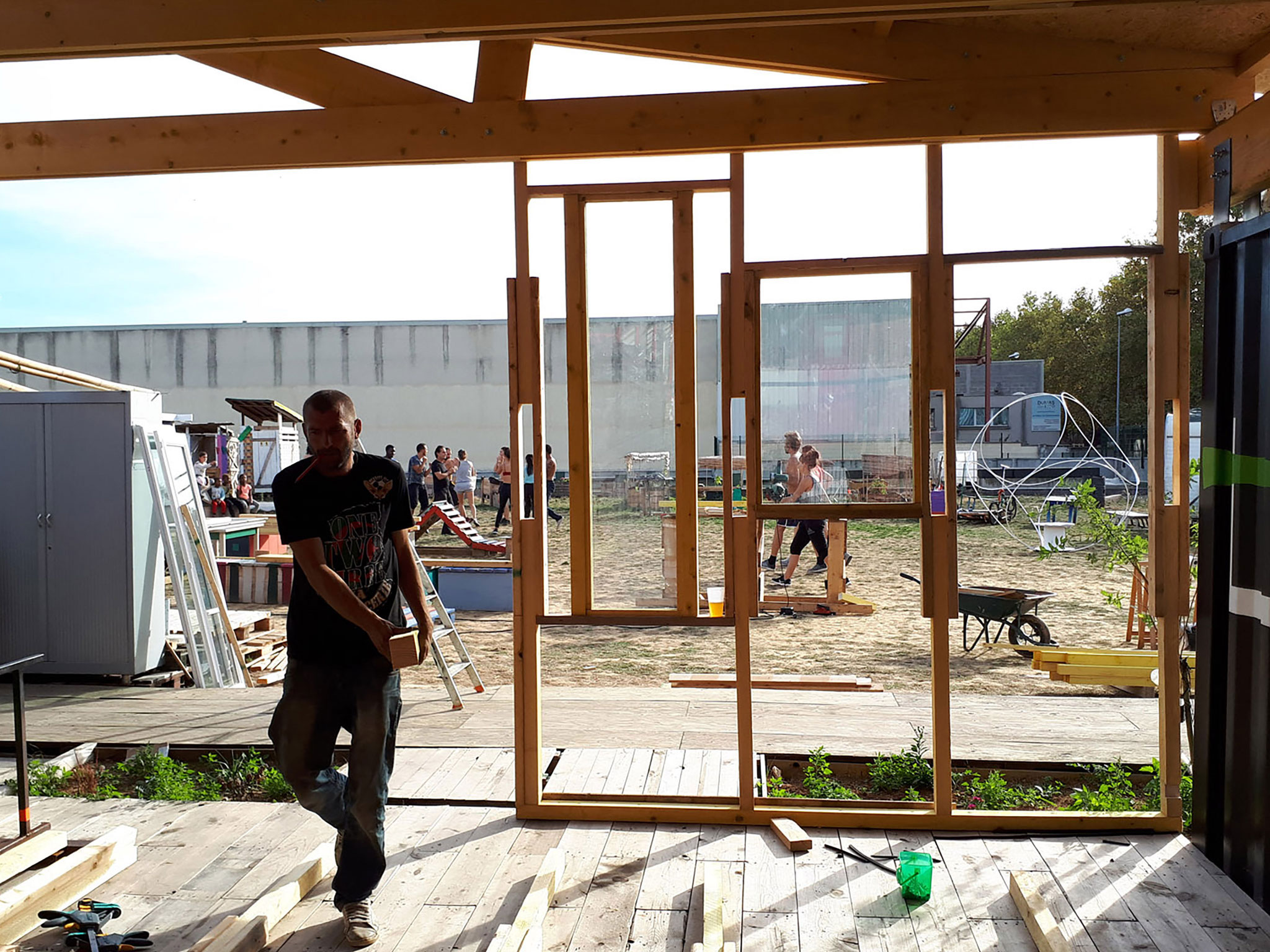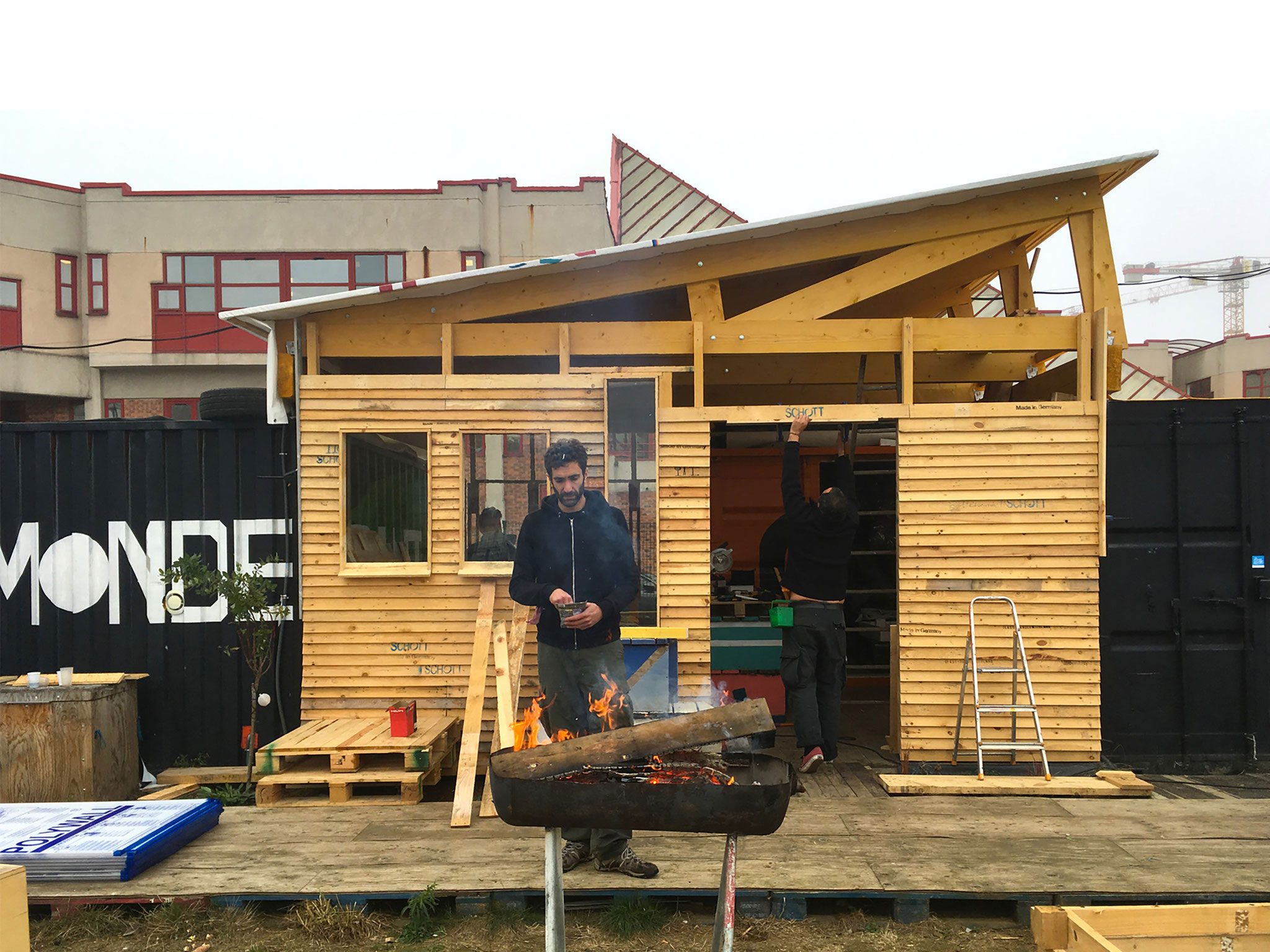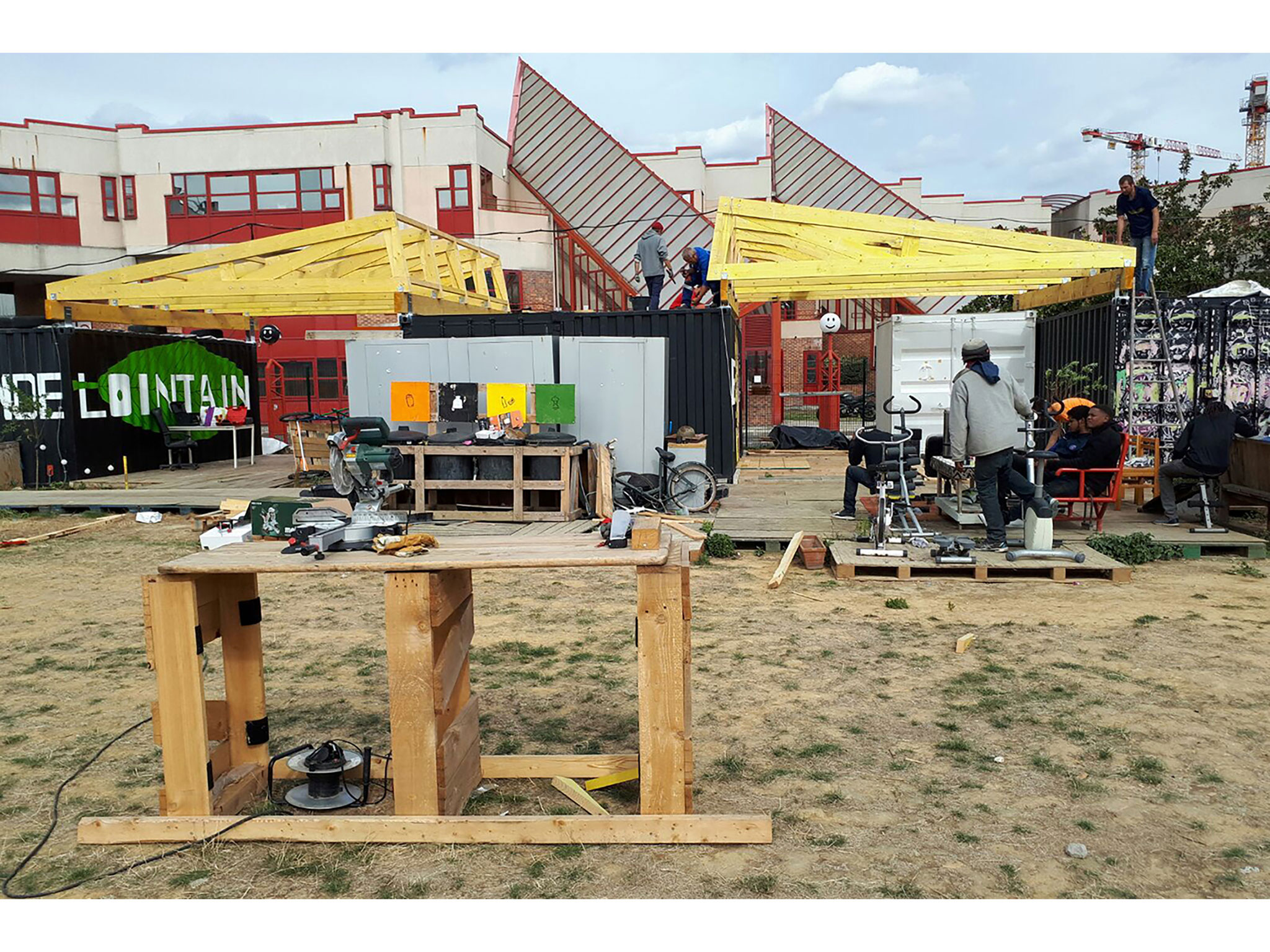 Dans le cadre d’une résidence au sein de l’Espace Imaginaire nous avons été chargé de concevoir et fabriquer un atelier de fabrication et un « kiosque solidaire » d’environ 25 m² chacun. Après plusieurs ateliers de concertation avec les usagers du site et s+A!, Secousses Architectes a dessiné le système constructif des abris s’appuyant sur les containers existants.