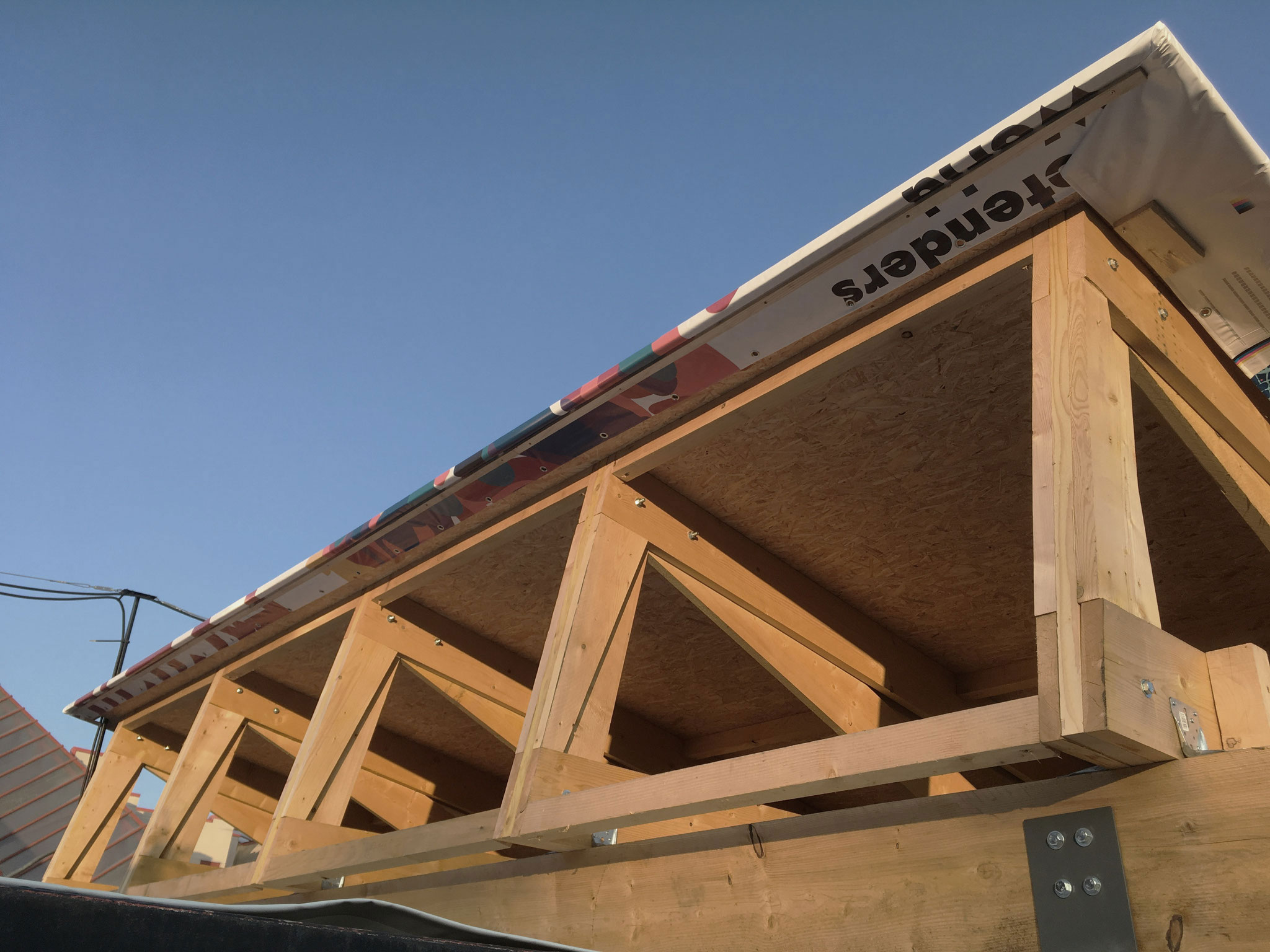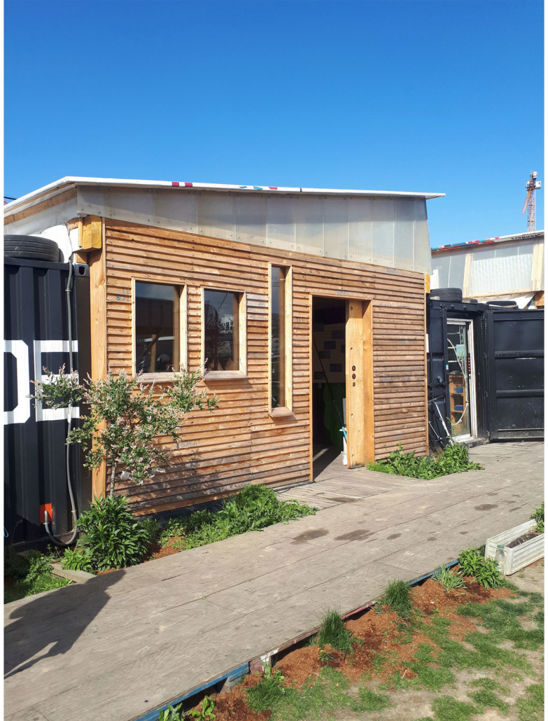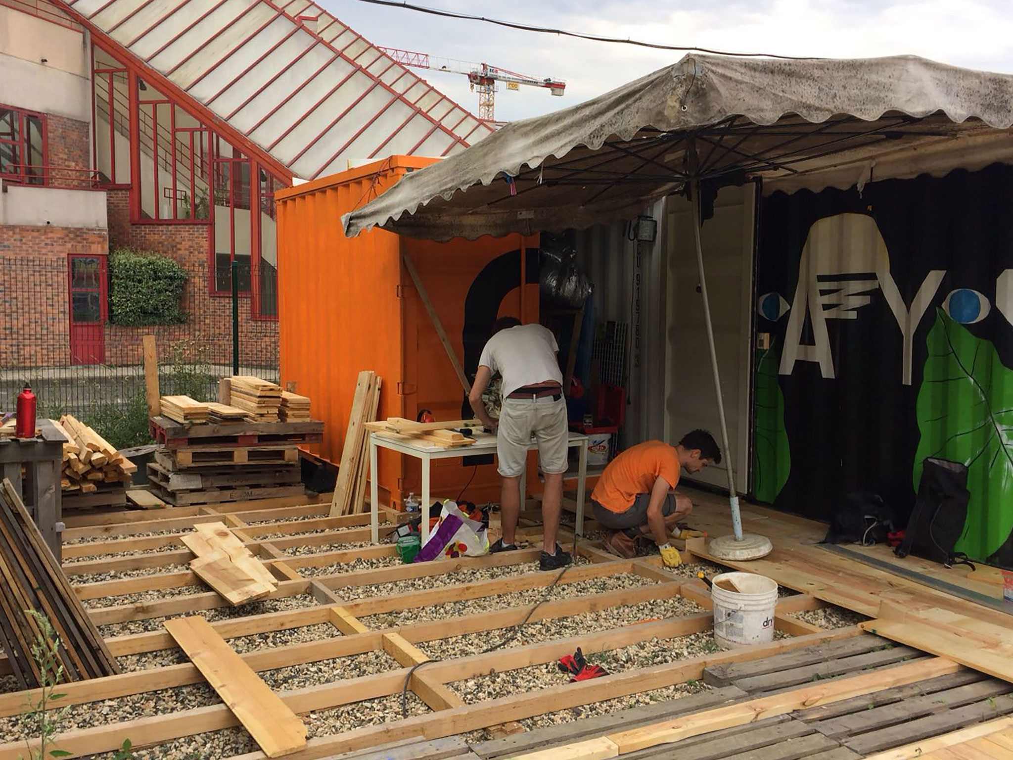 Dans le cadre d’une résidence au sein de l’Espace Imaginaire nous avons été chargé de concevoir et fabriquer un atelier de fabrication et un « kiosque solidaire » d’environ 25 m² chacun. Après plusieurs ateliers de concertation avec les usagers du site et s+A!, Secousses Architectes a dessiné le système constructif des abris s’appuyant sur les containers existants.